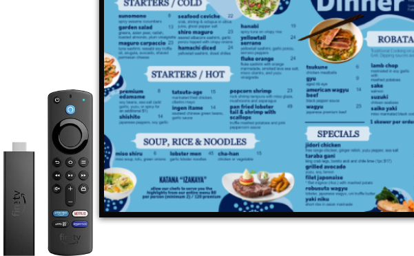 Using DsMenu on Fire TV Stick means you can turn any TV into a professional digital menu display in just a few minutes. Simply install the DsMenu app from the Amazon Appstore, log in with your account, and your menus appear instantly on screen. No complex wiring, no media players, and no extra maintenance — the Fire TV Stick acts as your compact, reliable digital signage device.