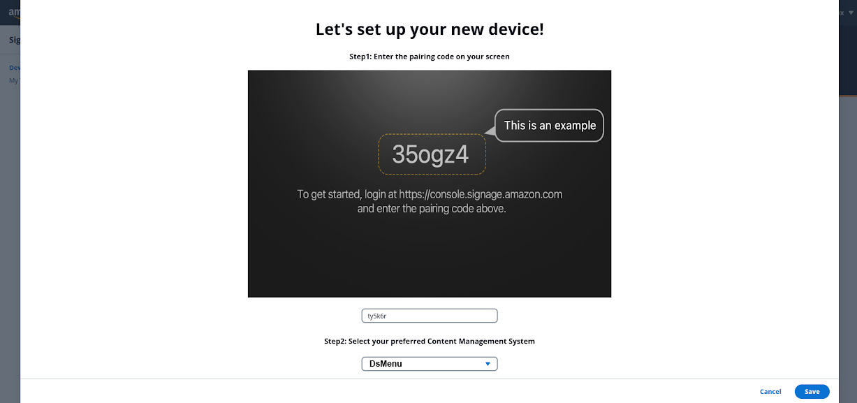 - Input your pairing code as shown on your device, and select “DsMenu” as your preferred Content Management System, then click “Save”